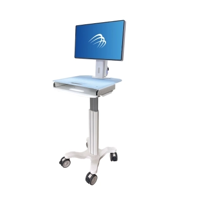 This powered medical trolley is equipped with an integrated screen on an adjustable arm for optimal ergonomics. Its multidirectional wheels and low weight make it easy to manoeuvre and move around. This cart is CE Medical certified